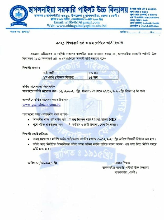 ২০২১ শিক্ষাবর্ষে ষষ্ঠ ও নবম শ্রেণীতে ভর্তি বিজ্ঞপ্তি